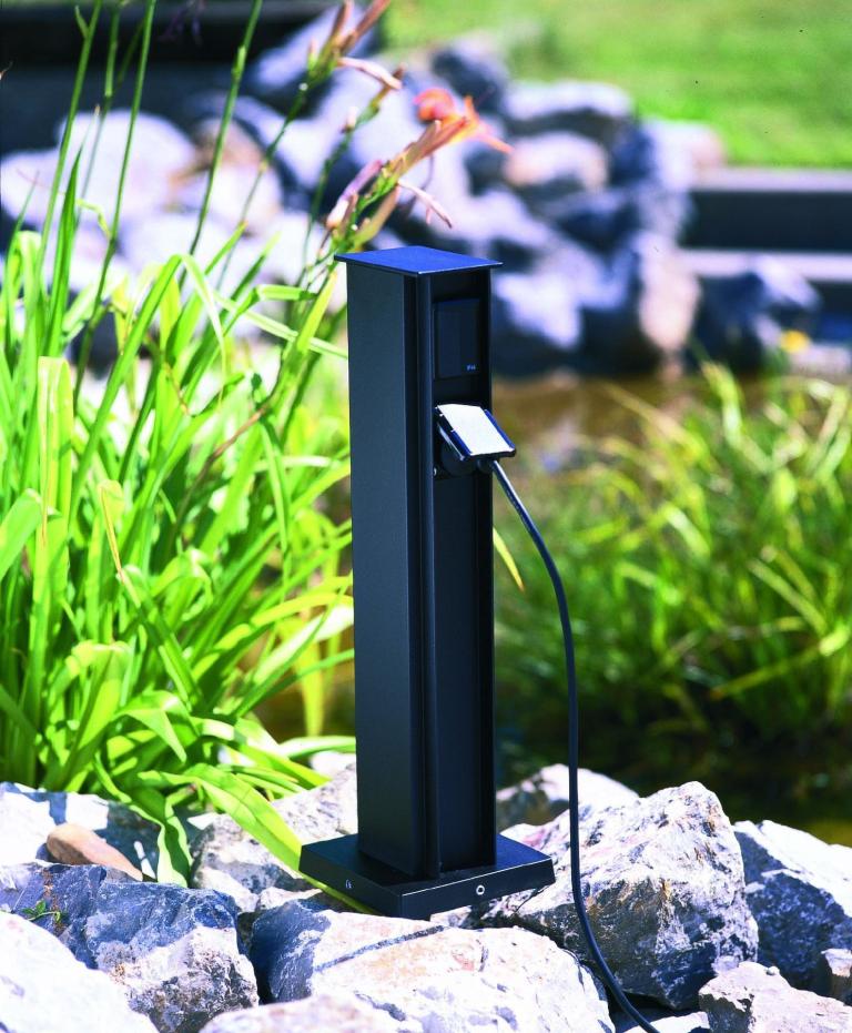 Albert Steckdosensäule mit 4 Steckdosen in schwarz. Mit erhöhtem Berührungsschutz.